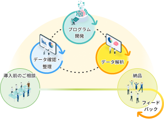 課題がまだ固まっていない、といったお悩みの解決策を言語化する技術導入に関するコンサルテーションから、開発技術の実装や、運用する人材の育成まで、データサイエンスのプロが一貫してサポートします。